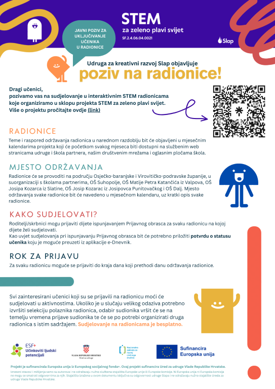 Udruga za kreativni razvoj SLAP poziva svu zainteresiranu djecu da se uključe u zanimljive i zabavne STEM aktivnosti u sklopu projekta “STEM za zeleno plavi svijet”.
