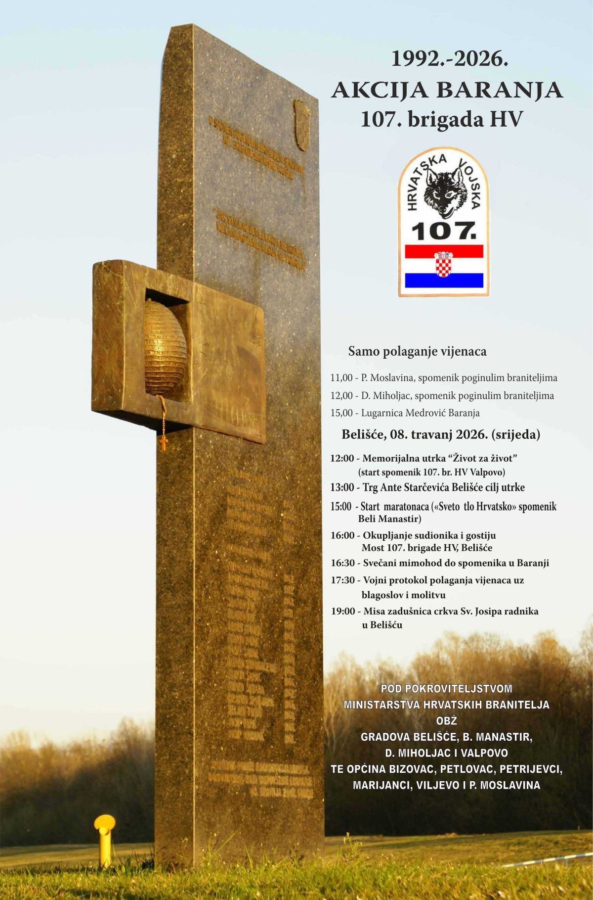 Program obilježavanja, čiji su pokrovitelji Ministarstvo hrvatskih branitelja, Osječko-baranjska županija, gradovi Belišće, Beli Manastir, Donji Miholjac i Valpovo te općine Bizovac, Petlovac, Petrijevci, Marijanci, Viljevo i Podravska Moslavina, održat će se 8. travnja 2026. godine.