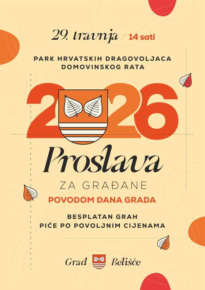 BELIŠĆE Grad Belišće poziva sve građane na zajedničku proslavu povodom Dana grada koja će se održati 29. travnja s početkom u 14 sati u Parku hrvatskih dragovoljaca Domovinskog rata.