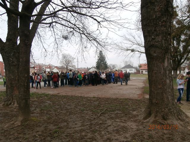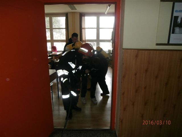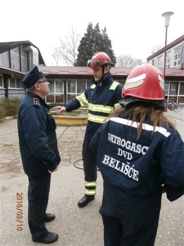 Kratak tijek vježbe je bio sljedeći: „Po nastalom događaju požara kotlovnice, ravnatelj s nastavnicima oglasio je tihu uzbunu za evakuaciju učenika i osoblja škola iz ugroženog objekta. Evakuacija se obaljvlja po Planu za evakuaciju Osnovne škole, gdje je zborno mjesto na platu igrališta. Svaki nastavnik provjerava prisutnost i broj učenika koji su obavili evakuaciju odnosno da li su svi prisutni, te predaju brojno stanje, ravnatelju škole. U međuvremenu, tehničko osoblje škole obavlja radnje isključivanja objekta u bez naponsko stanje i zatvaranje plinskih dovoda prema objektu. Nakon podnošenja izvješta o stanju obavljene evakuacije, došlo je do saznanja da nedostaju dva učenika. O nastalom događaju ravnatelj obavještava žurne službe, prije svega središnju vatrogasnu postrojba DVD-a Belišće, koji po dojavi dolaze na mjesto nastalog požara sa dva navalna vozila, gdje ravnatelj upoznajte zapovjednika o nastalom požaru i obavljenoj evakuacije i da nedostaju dva učenika koja su ostala u objektu škole. Zapovjednik DVD Belišća izdaje zapovjed spašavanja dvije osobe – učenika, gdje jedna vatrogasna grupa sa izolacijskim aparatima i mlazom brze navale ulazi u objekat škole. Nakon pronalaska učenika, vatrogasci ih dovode van objekta, gdje ih predaju ekipi Prve pomoći Osnovne škole koji obavljaju radnje prve pomoći, a potom po potrebi ih predaju službi Hitne pomoći. U međuvremenu prva vatrogasna grupa nakon predaje učenika, poduzima radnje gašenja požara unutar objekta prema kotlovnici, a druga i treća vatrogasna grupa iz drugog vozila, obavljaju radnje gašenja požara obuhvatnom navalom s vanjske strane objekta. Druga vatrogasna grupa obara nastale plinove pomoću raspršenog mlaza, a treća vatrogasna grupa gasi požar na kotlovnici pomoću pjene.“ Obavljenom evakuacijom, te spašavanjem i gašenjem požara, vježba ispunjava svoj cilj.“ |