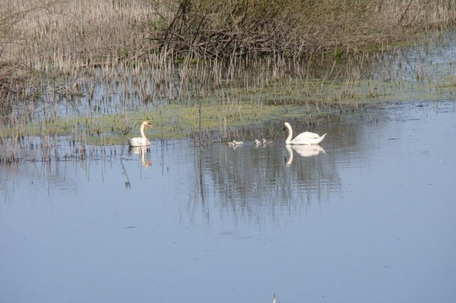 Pri povratku još jedan zadivljujući prizor. Na bari Jugovači ugledali smo jedan par labudova sa svojim pomlatkom od 4 člana.