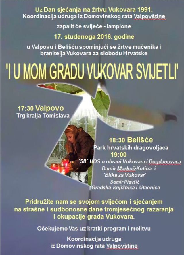 U četvrtak, 17. studenoga, s početkom u 17 sati i 30 minuta u Valpovu, na Trgu kralja Tomislava, a u 18 sati i 30 minuta u Belišću, u Parku hrvatskih dragovoljaca, zapalit će svijeće i lampione spominjući se žrtve mučenika i branitelja Vukovara za slobodu Hrvatske.