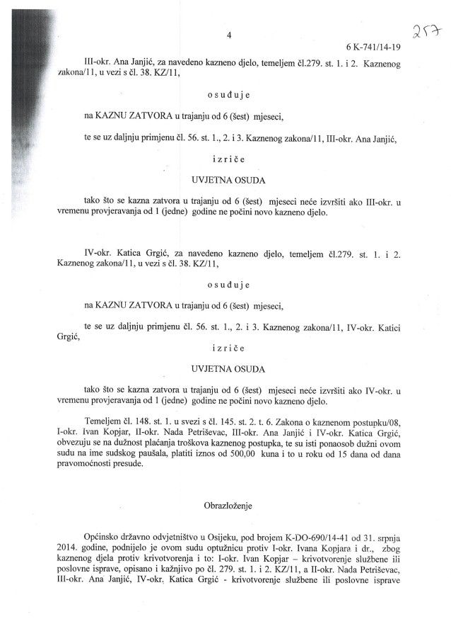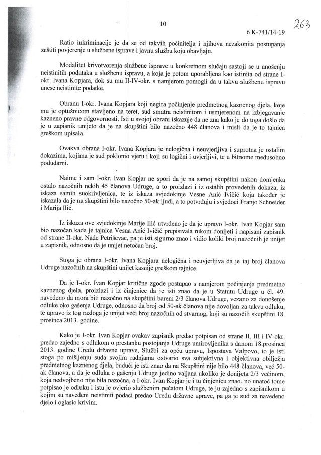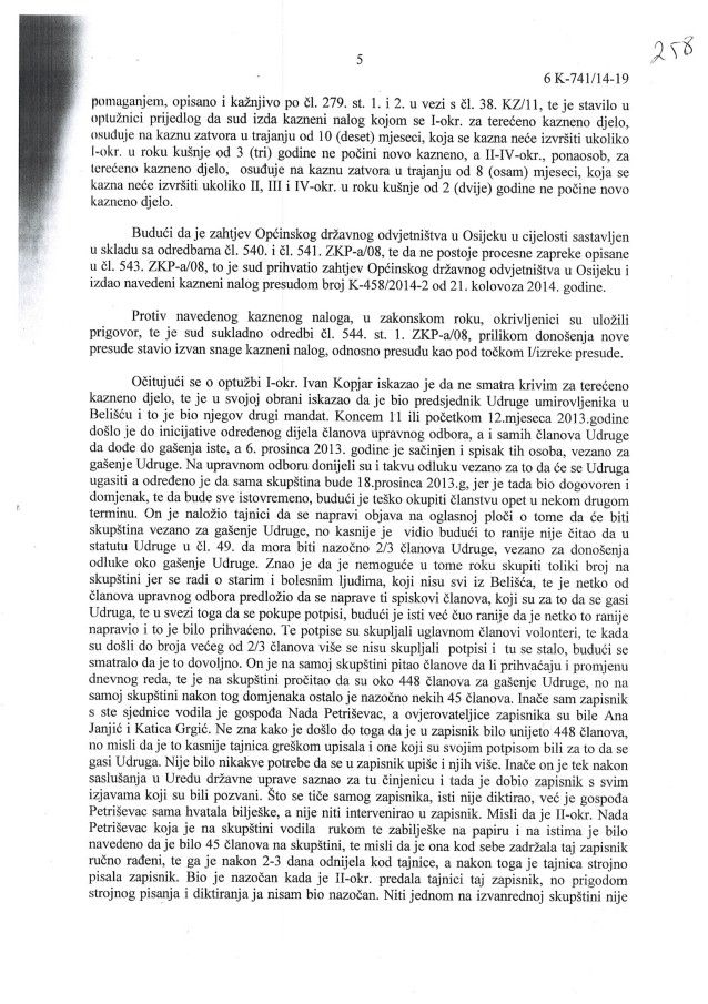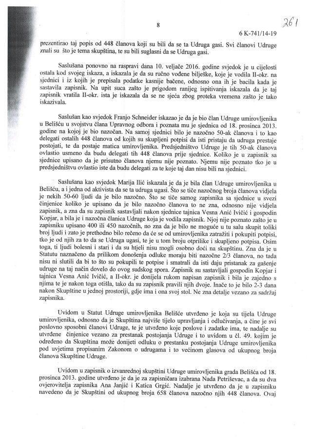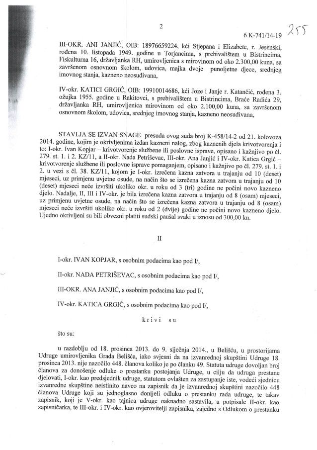 U međuvremenu odmah početkom 2014. je neuspješno izvršen i nezakonit pokušaj gašenja Udruge umirovljenika grada Belišća putem kaznenog djela krivotvorenja isprava udruge, zbog čega je pravomoćno kazneno osuđeno 5 članova udruge i to zatvorskim uvjetnim kaznama. Među osuđenima su i tadašnja tajnica Vesna Anić i tadašnji predsjednik Ivan Kopjar.