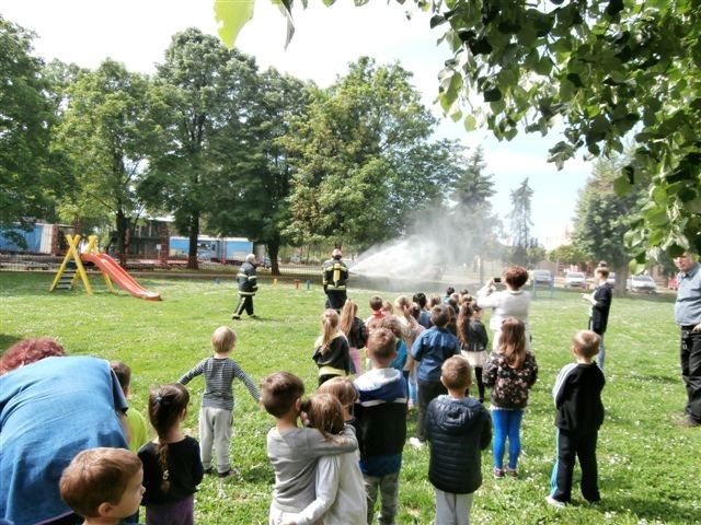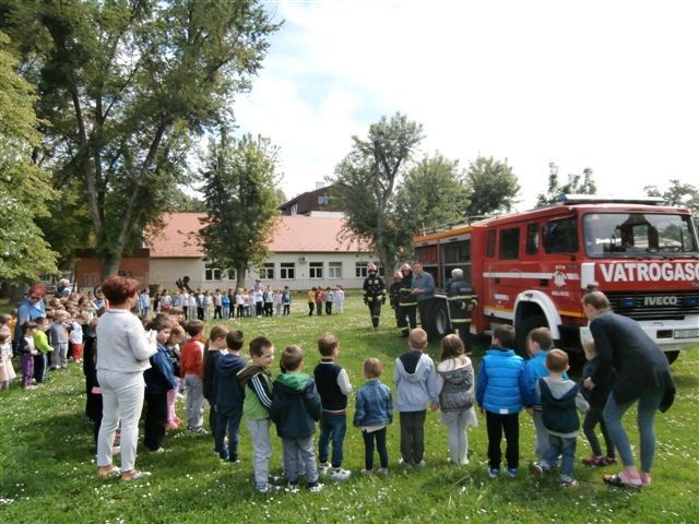 U dvorišnom prostoru vrtića za okupljenje mališane i njihove tete, prezentirana je vježba s vatrogasnim vozilom i korištenje vatrogasnih mlazeva. Ujedno su djeca imala priliku vidjeti vatrogasce u zaštitnim intervencijskim odjelima i opremom za disanje koju koriste na požarnim intervencijama, što ih je vaoma zanimalo uz mnogobrojne upite, a poneki mališani su se okušali u korištenju vatrogasne opreme.