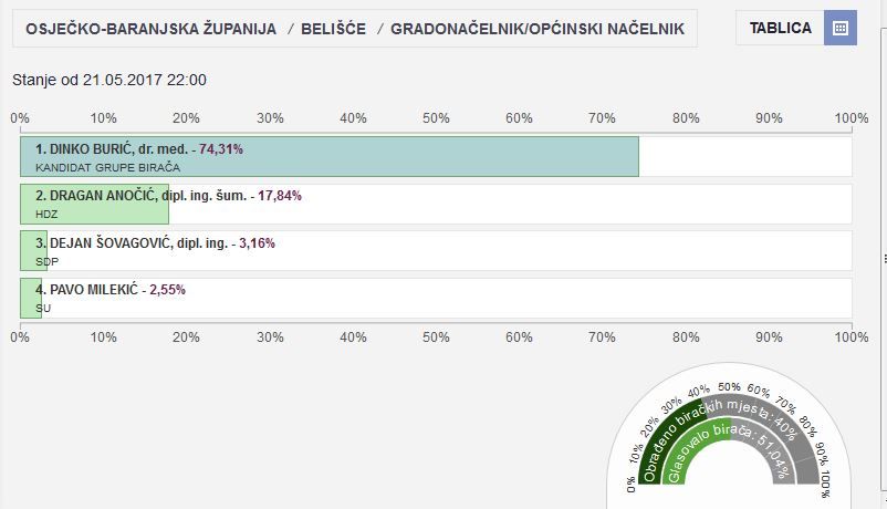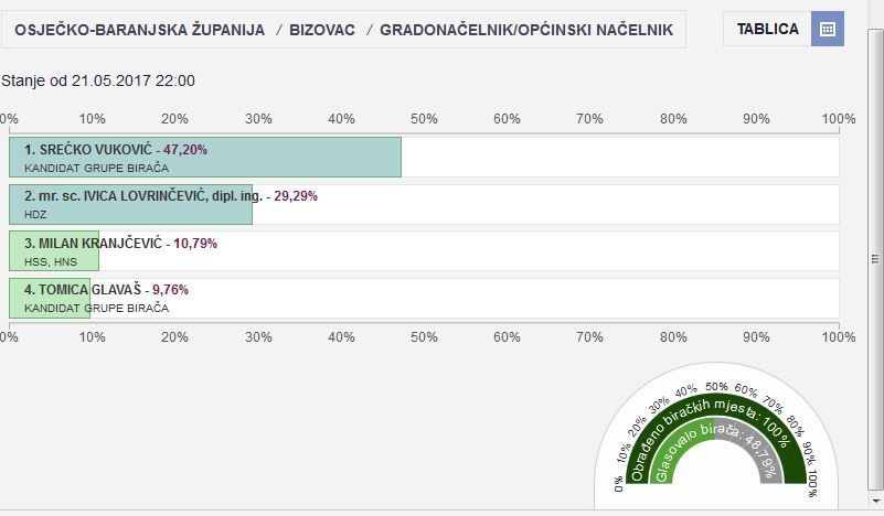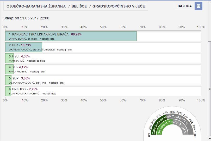 Bizovac - Ukupno 3.800 birača, 7 biračkih mjesta, na 4 biračka mjesta koja su dostavila izvješća glasovalo 551 od 1478 birača - 37,28%