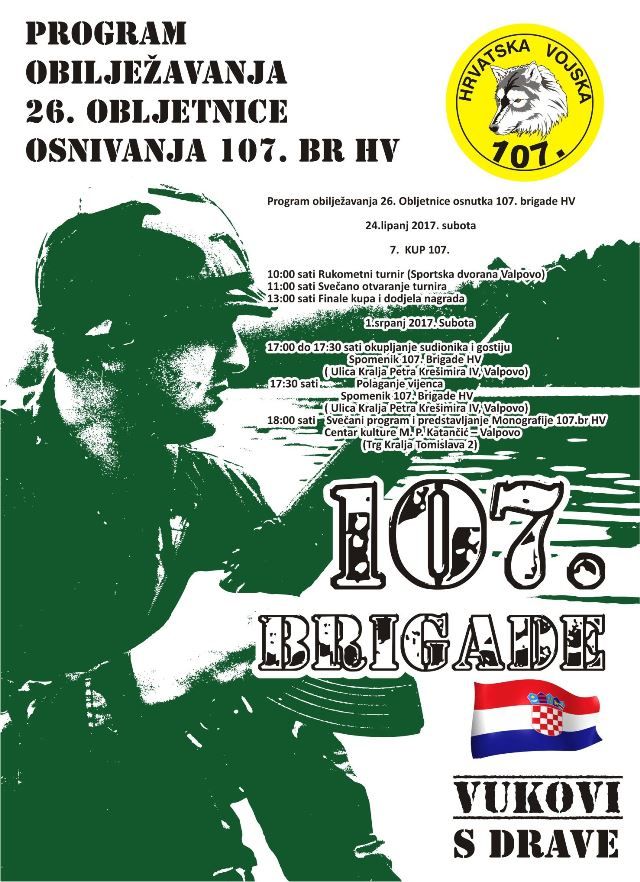Prvi dio programa održan je u prošlu subotu, kada je odigran tradicionalni rukometni kup, a predstojeće suborte, program se nastavlja polaganjem vijenaca na spomenik 107. Brigadi u ulici Kralja Petra Krešimira IV u Valpovu te svečanim programom i predstavljanjem monografije !07.brigada HV – Vukovi s Drave.