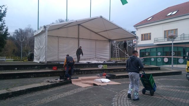 Na drugom kraju pješačke zone, podiže se prigodni šator na pozornici koja bi trebala ugostiti razne izvođače, zabavljače posjetitelja Adventskog sajma i dočeka Nove godine na središnjem trgu. Tako će izvođači biti zaštićeni od vremenskih iznenađenja da mogu bez poteškoća izvedbom svog zabavnog programa upotpuniti dobro raspoloženje u gledalištu.
