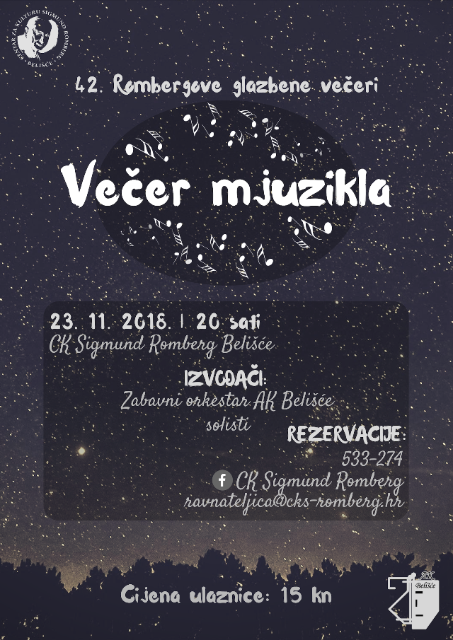 U Večeri mjuzikla uživajte u petak, 23. studenog 2018. godine s početkom u 20 sati u dvorani Centra za kulturu Sigmund Romberg. Ulaznice, po cijeni od 15 kuna, rezervirajte u Centru za kulturu na broj telefona 533-274 od 7 do 15 sati, na mail Ova e-mail adresa je zaštićena od spambota. Potrebno je omogućiti JavaScript da je vidite. ili na Facebook stranici Centra.