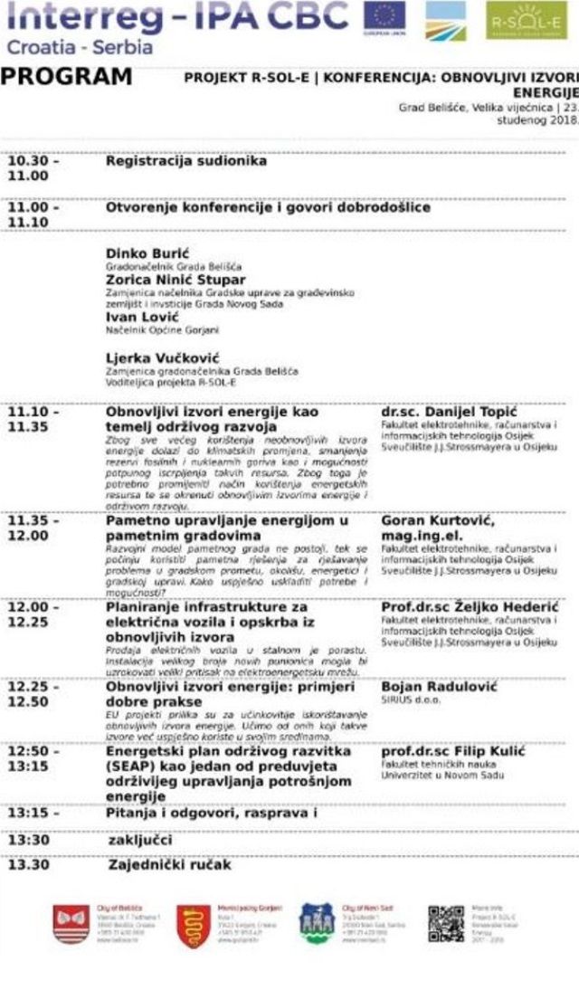 BELIŠĆE U sklopu projekta R-SOL-E Renewable Solar Energy, Grad Belišće organizira konferenciju na temu: Obnovljivi izvori energije: izazovi i prilike za gradove budućnosti.