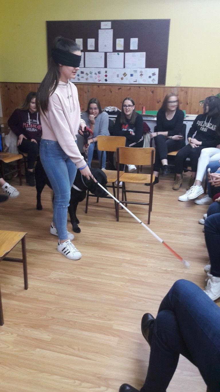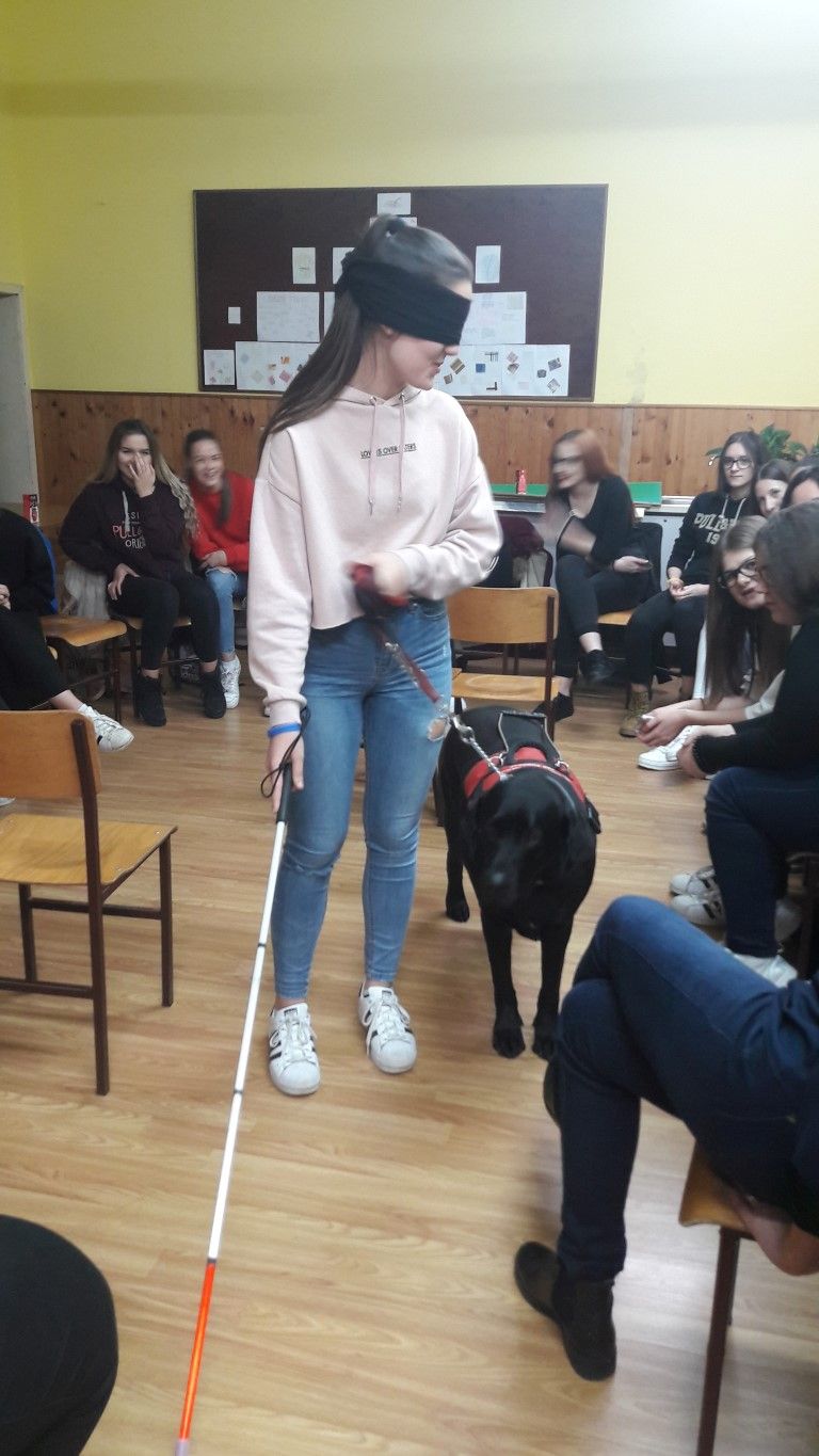 Učenici su se okušali u hodanju s bijelim štapom te u hodanju uz pomoć terapijskog psa.