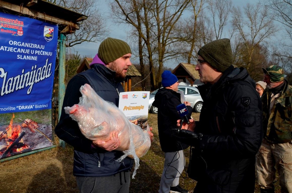 Nagrade je u ime organizatora uručio zamjenik gradonačelnika Domagoj Varžić pa mu je, između ostaloga, bilo posebno zadovoljstvo na pobjedi čestitati bratu Darku. Naime, Ivica Anić, zamjenik predsjednika Lovačkog društva "Vepar" Belišće, Vladimir Sever, predsjednik Hrvatskog športsko ribolovnog saveza i Vladimir Škrobo – Bajo, vlasnik "Baranjske kuće", ocjenjivali su okus, izgled, pikantnost i kvalitetu natjecateljskih uzoraka. Organizatori su uz pomoć sponzora, osigurali brojne nagrade za sudionike, a najviše je ocjene za uzorak ispečene slanine dobio Darko Varžič i ponio titulu ukupnog pobjednika ovogodišnje Slaninijade. Drugo je mjesto osvojio Nenad Čošić, a treće Miroslav Sudić. Nagrađeni su i najmlađi natjecatelj - Mario Babić te najmlađa Ira Sopić. Natjecanje je privuklo mnoštvo posjetitelja, među kojima je bio i zamjenik župana Goran Ivanović sa suradnicima, a Slaninijada je svima pružila dobru prigodu za ugodnu zabavu boravkom u prirodi na bistrinačkom Odmorištu uz Dravu, uz prigodnu gastronomsku ponudu. Dogodilo se i to da su sve ponuđene delicije razgrabljene!