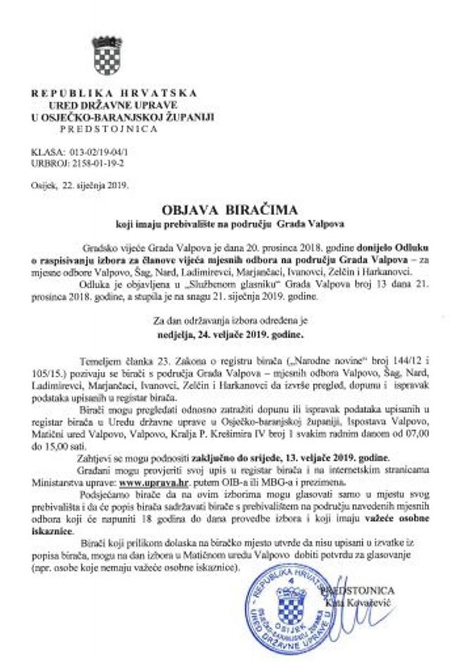 Tim povodom, predstojnica Ureda državne uprave, Kata Kovačević objavila je objavu biračima koji imaju prebivalište na području grada Valpova.