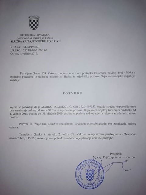-Gradonačelnik me u više navrata prozivao kako sam zaposlen u Županiji na radnom mjestu dostavljača. Nikada nisam bio zaposlen u Županiji, a to sam već u više navrata nakon prozivki od strane gradonačelnika dao i u medije. Kao potvrdu prilažem vam dokaz o obavljenom STRUČNOM OSPOSOBLJAVANJU BEZ ZASNIVANJA RADNOG ODNOSA. Dakle, bio sam na stručnom osposobljavanju u Službi za zajedničke poslove u trajanju od godinu dana, a koje mi je završilo 31.siječnja ove godine. Nezaposlen sam te sam prijavljen na zavod za zapošljavanje kao i većina građana ove države.