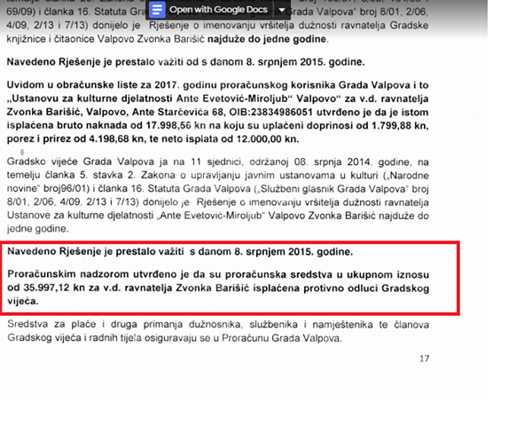 Nadalje, tajnik Grada Valpova, Zvonko Barišić od 8. srpnja 2015. godine nezakonito vrši dužnost ravnatelja dvije kulturne ustanove za što su mu isplaćena sredstva u iznosu od 35.997,12 hrk. I dalje je na navedenim funkcijama bez odluke Gradskog vijeća na što sam u više navrata upozoravao, međutim nitko nije reagirao.