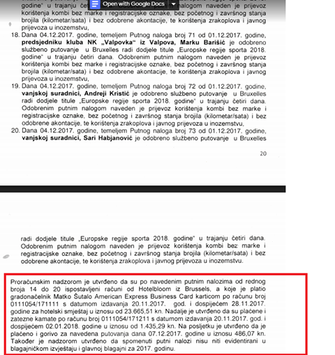 Da se vratimo na Bruxelles. Kao što je inspektorat proračunskog nadzora utvrdio da su na navedeni put išli na temelju NEVJERODOSTOJNE KNJIGOVODSTVENE DOKUMENTACIJE. Dokazano je da niti jedan putni nalog nije ispisan na temelju vjerodostojne knjigovodstvene dokmentacije. A jasno piše da je za sve aktere koji su išli na sporni put u Bruxelles gradonačelnik Matko Šutalo osobno platio American Express Business Card karticom GRADA VALPOVA. Dakle, svi porezni obveznici su to financirali.