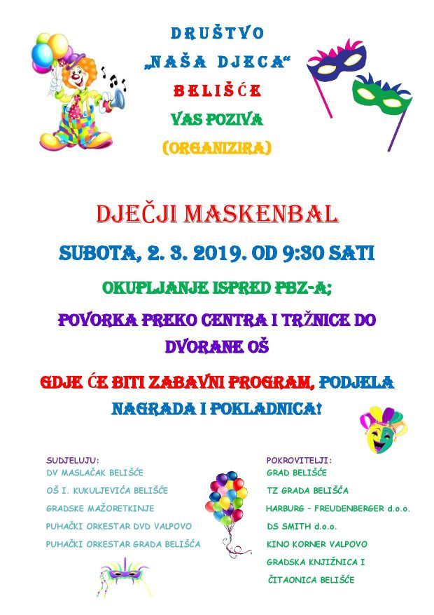 BELIŠĆE Društvo Naša djeca grada Belišća poziva svu djecu grada Belišća te prigradskih naselja da dođu na Dječji maskenbal, u subotu, 2. ožujka. 2019. godine.