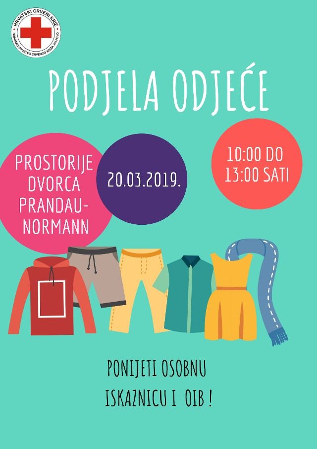 Podjela odjeće održati će se u srijedu, 20. OŽUJKA 2019. od 10:00 do 13:00 sati u prostorijama dvorca Prandau - Normann.