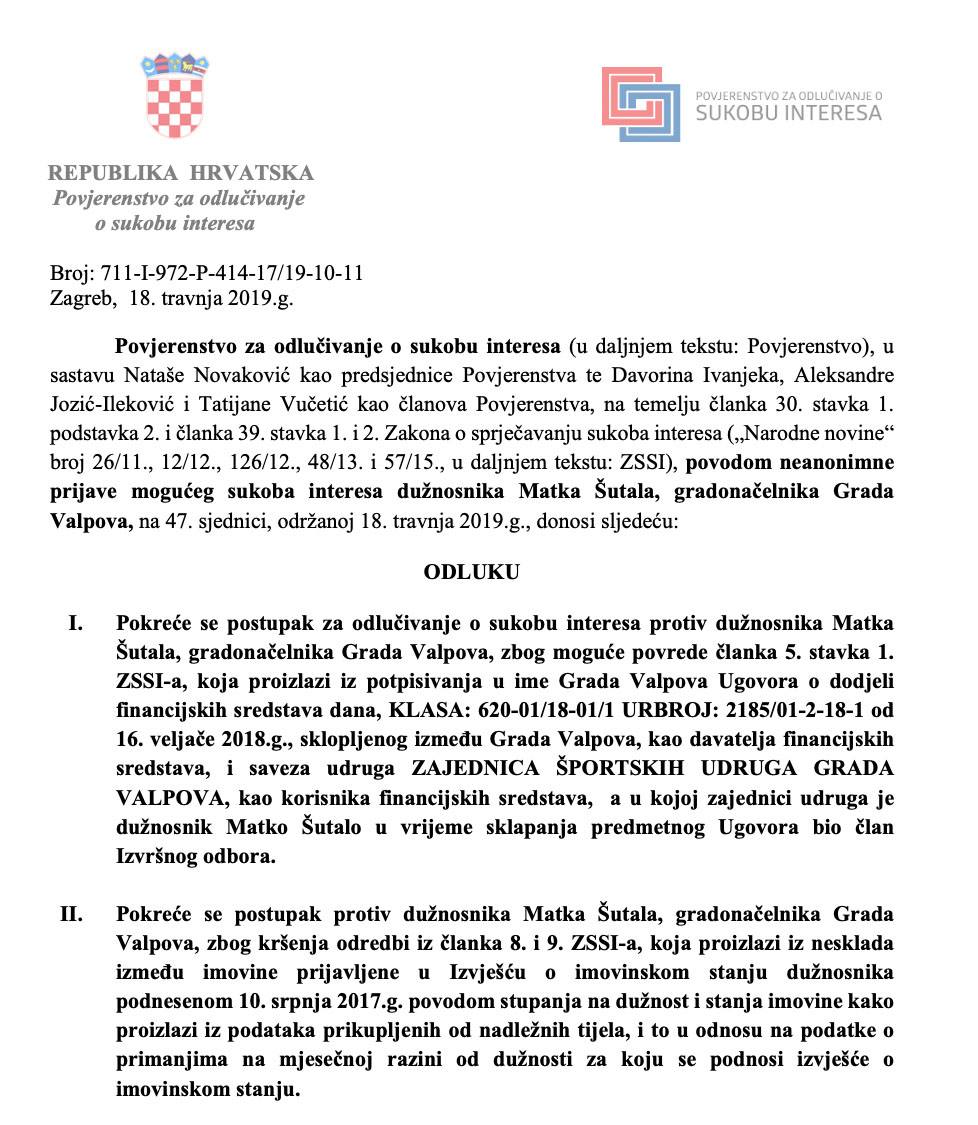 VALPOVO Povjerenstvo za odlučivanje o sukobu interesa, povodom neanonimne prijave mogućeg sukoba interesa dužnosnika Matka Šutala, gradonačelnika Grada Valpova odlučilo je pokrenuti postupak za odlučivanje o sukobu interesa zbog moguće povrede nekih odredbi Zakona o sprječavanju sukoba interesa.