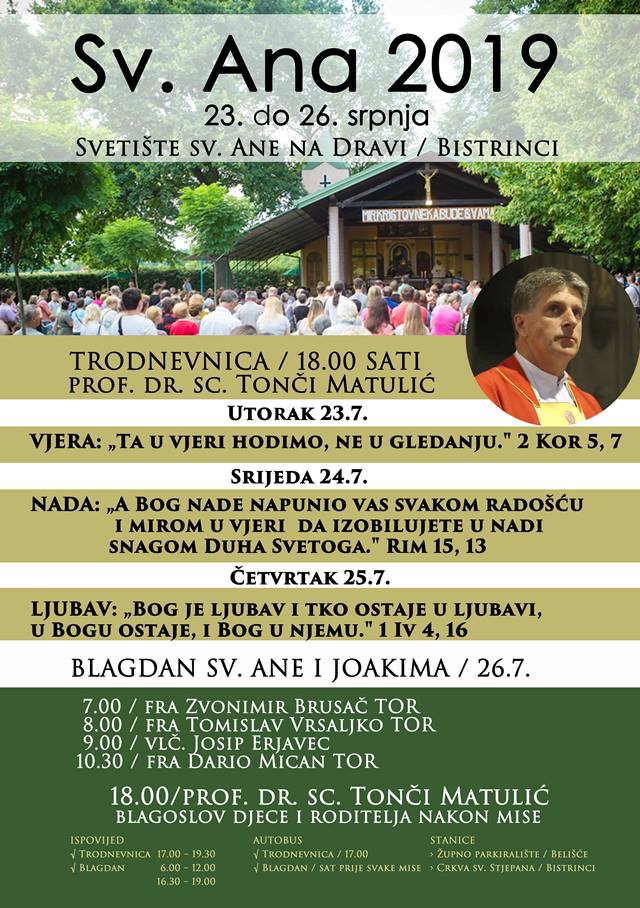 Na blagdan sv. Ane misna slavlja su u 7.00, 8.00, 9.00, 10.30, i 18.00 sati. Hodočasničku misu u 7.00 sati predslaviti će fra Zvonimir Brusač TOR, a svečano misno slavlje s početkom u 18.00 sati na blagdan sv. Ane i Joakima predslaviti će prof. dr. sc. Tonči Matulić, a po završetku svete mise uslijedit će tradicionalni blagoslov djece i roditelja. Mogućnost za ispovijed na blagdan sv. Ane je od 6.00 do 12.00 i od 16.30 do 19.00 sati.