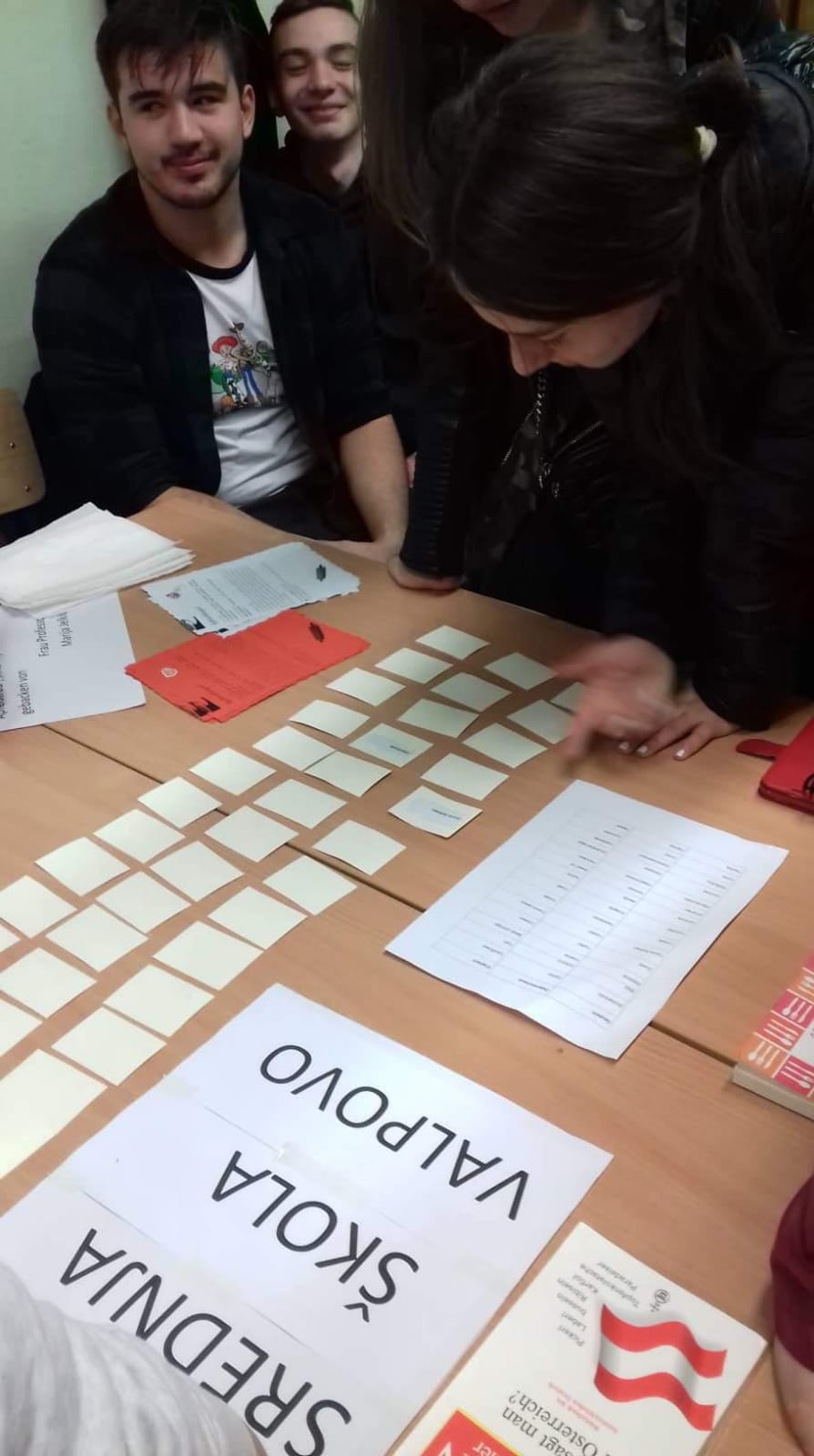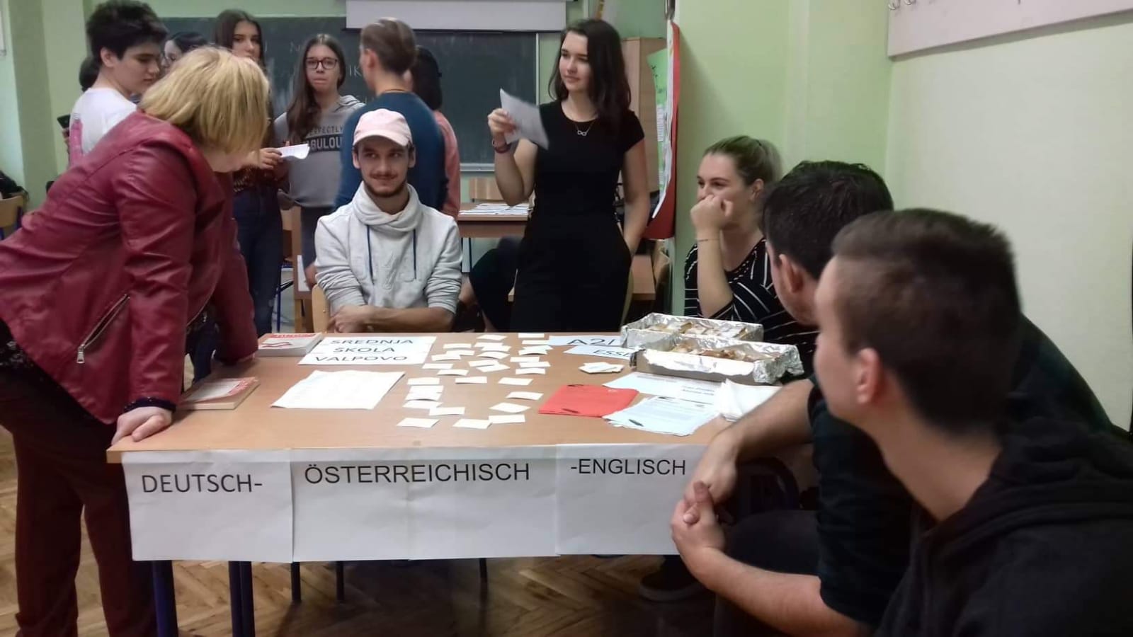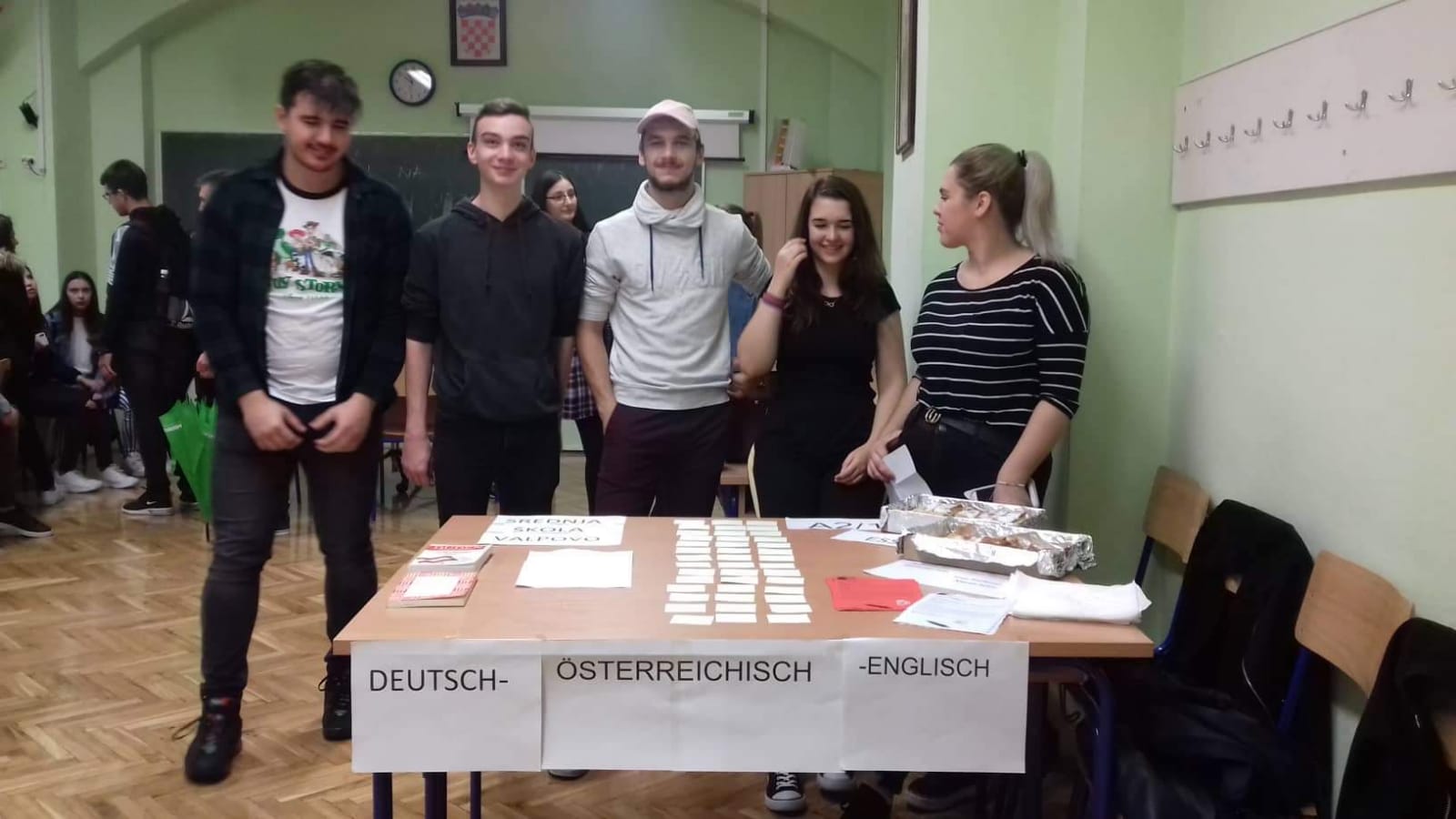Naši su se učenici (Laura Grgec, Labina Đuranić i Bruno Funtak) te 4. OG B razreda (Sonja Blažević, David Petrović i Dorian Ilinić) zajedno sa svojom profesoricom njemačkog jezika, Snježanom Simić, predstavili štrudlama od jabuke i sira, napravljenih po receptu iz austrijske kuharice, a koje je pripremila prof. Marija Jelkić. Također, pripremili su interaktivnu igru memorije koja je sadržavala riječi (hranu) na austrijskom, njemačkom i engleskom jeziku. Ovaj događaj bio nam je prilika za druženje i učenje jezika na zanimljiv način.