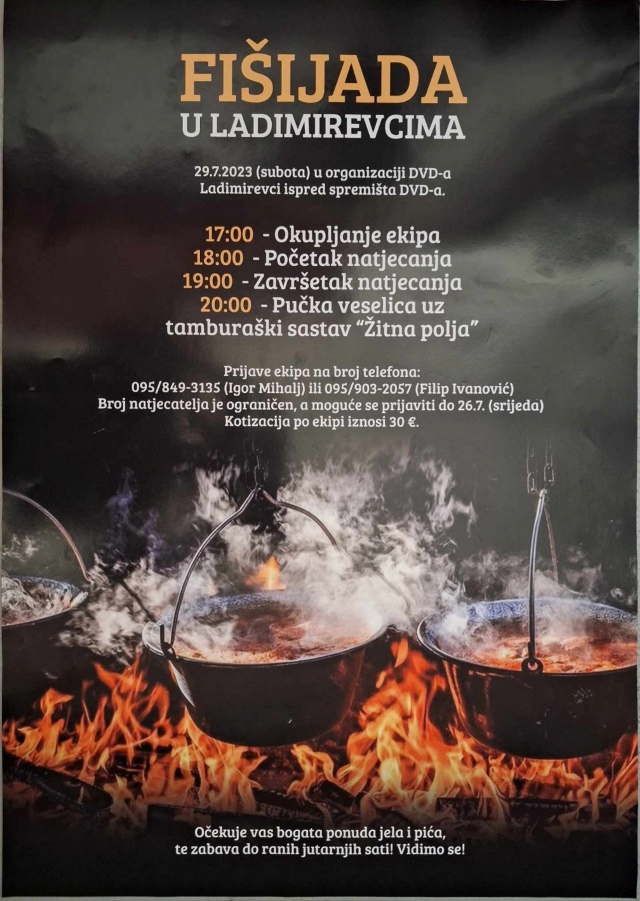 LADIMIREVCI Povodom proslave 90. godina rada, DVD-a Ladimirevci organizira tradicionalnu Fišijadu ispred spremišta DVD-a Ladimirevci.