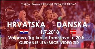 VALPOVO Grad Valpovo poziva sve sugrađane i goste u nedjelju 1. srpnja 2018, u 20:00 h na zajedničko praćenje utakmice Hrvatska – Danska putem video zida na Trgu kralja Tomislava.